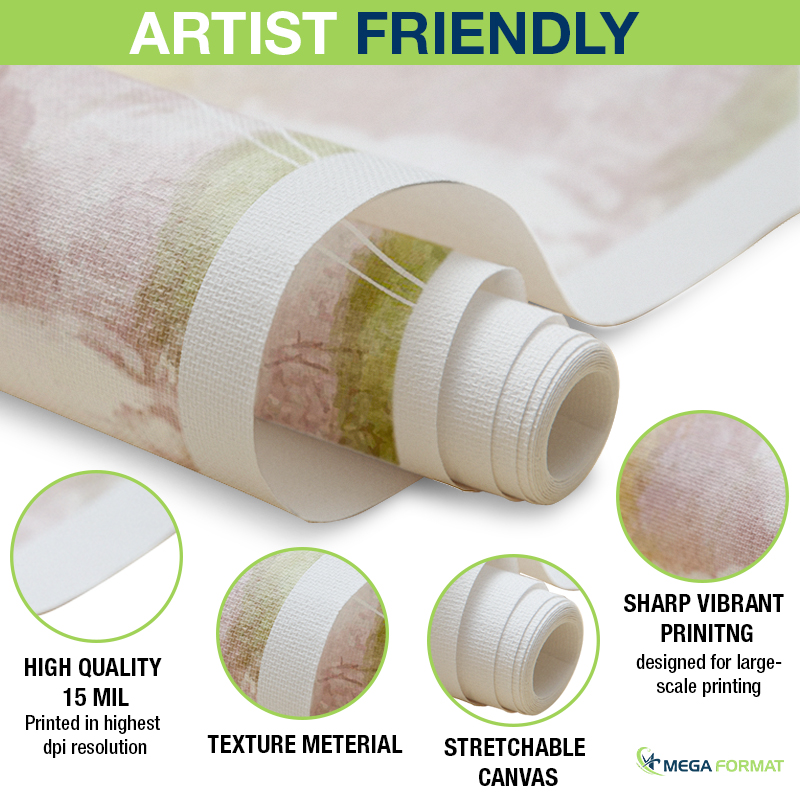 Mega Format deals in various dimensions and size for canvas printing. We can work with you to adjust your artwork or images to fit the canvas size you require. You can turn your photo into great canvas prints or pick any natural scene, classic art type, your personal photographs or digital images of all-time favorite artists. Let’s say, you need canvas print for a specific wall at your workplace or home; you can upload the design file, measurements, and format, rest we assure you the top quality print, satisfaction and value for the money.