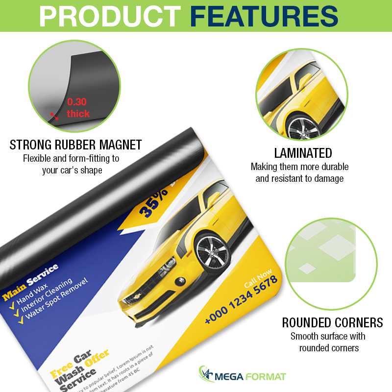 Mega format Inc. uses high-quality magnets that hold up even when the vehicle is in motion on smooth or rough terrains. To order simply upload your artwork, containing your logo, short service message, and your contact information and we’ll print it to perfection. All our signs are simple and lay flat across the door or on the back of the car.